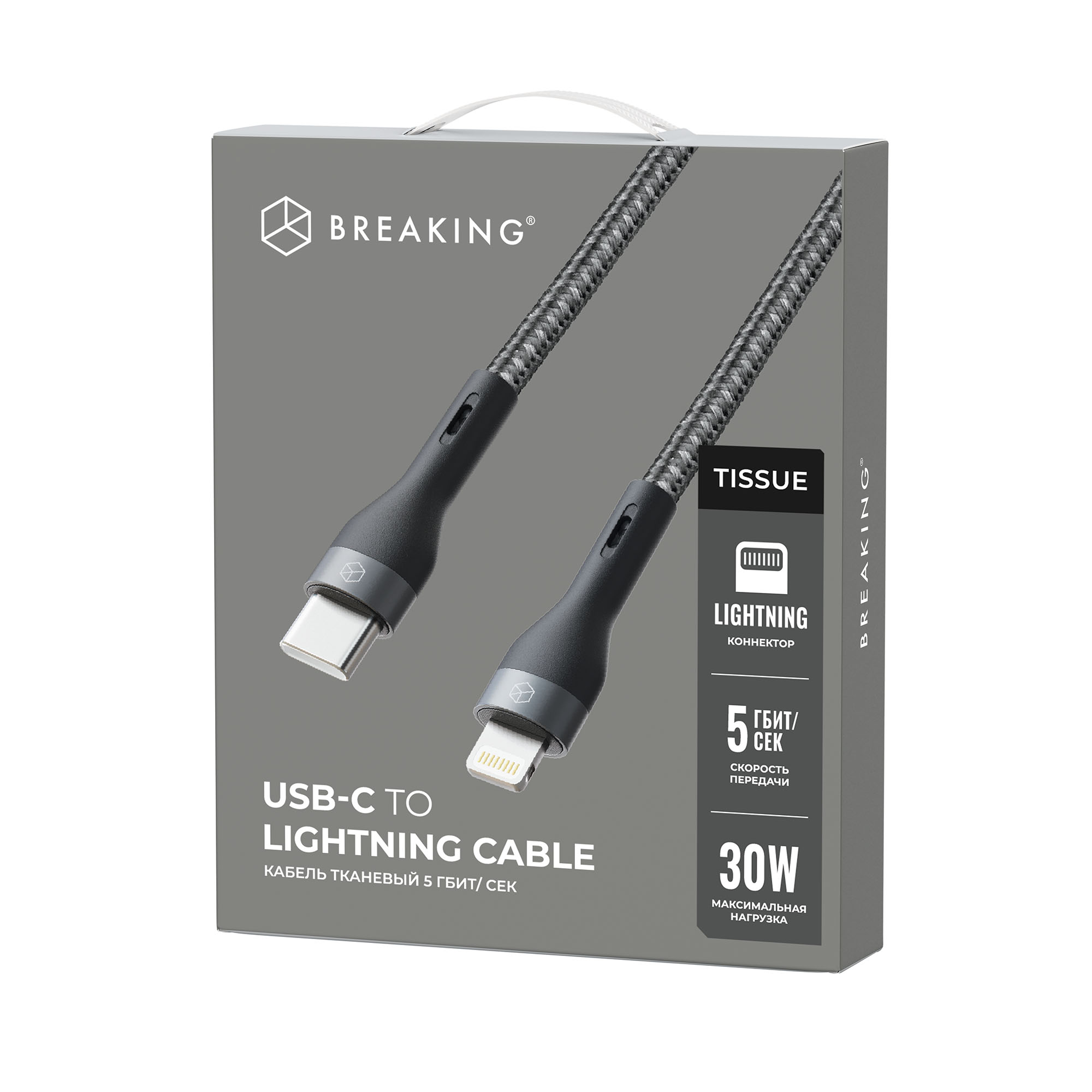 Кабель Breaking Tissue USB-C - Lightning, 30W, 3A, 1м (Черный)